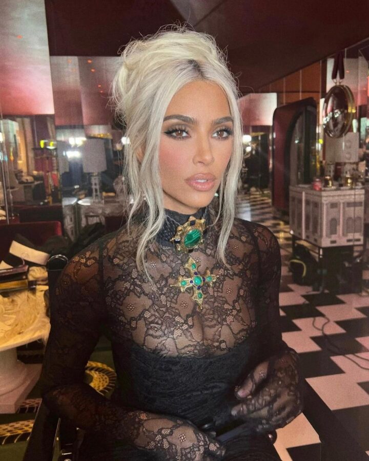 Kim wore a barely sleeker model of the fashion the month earlier than (when her hair was deep brunette) for the premiere of The Kardashians on Hulu.